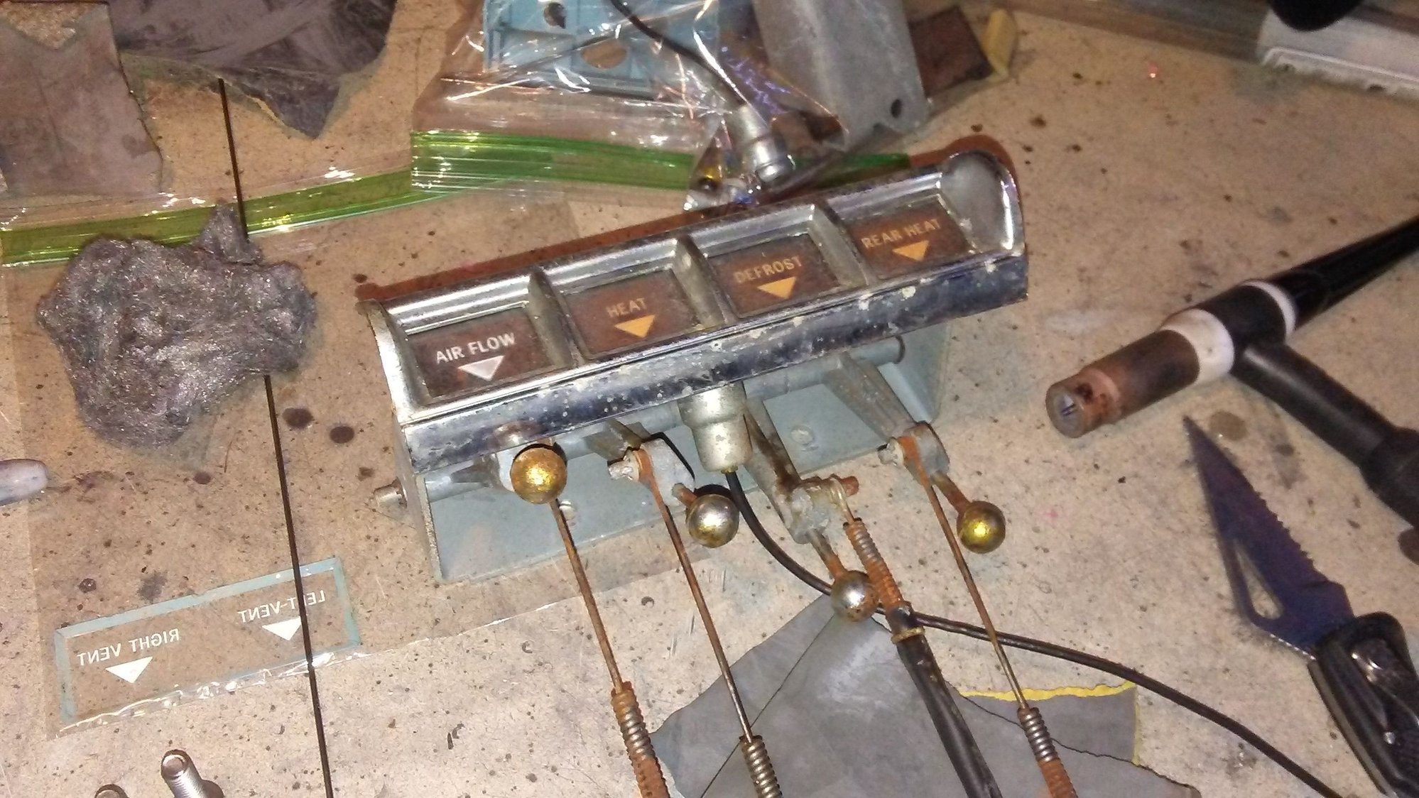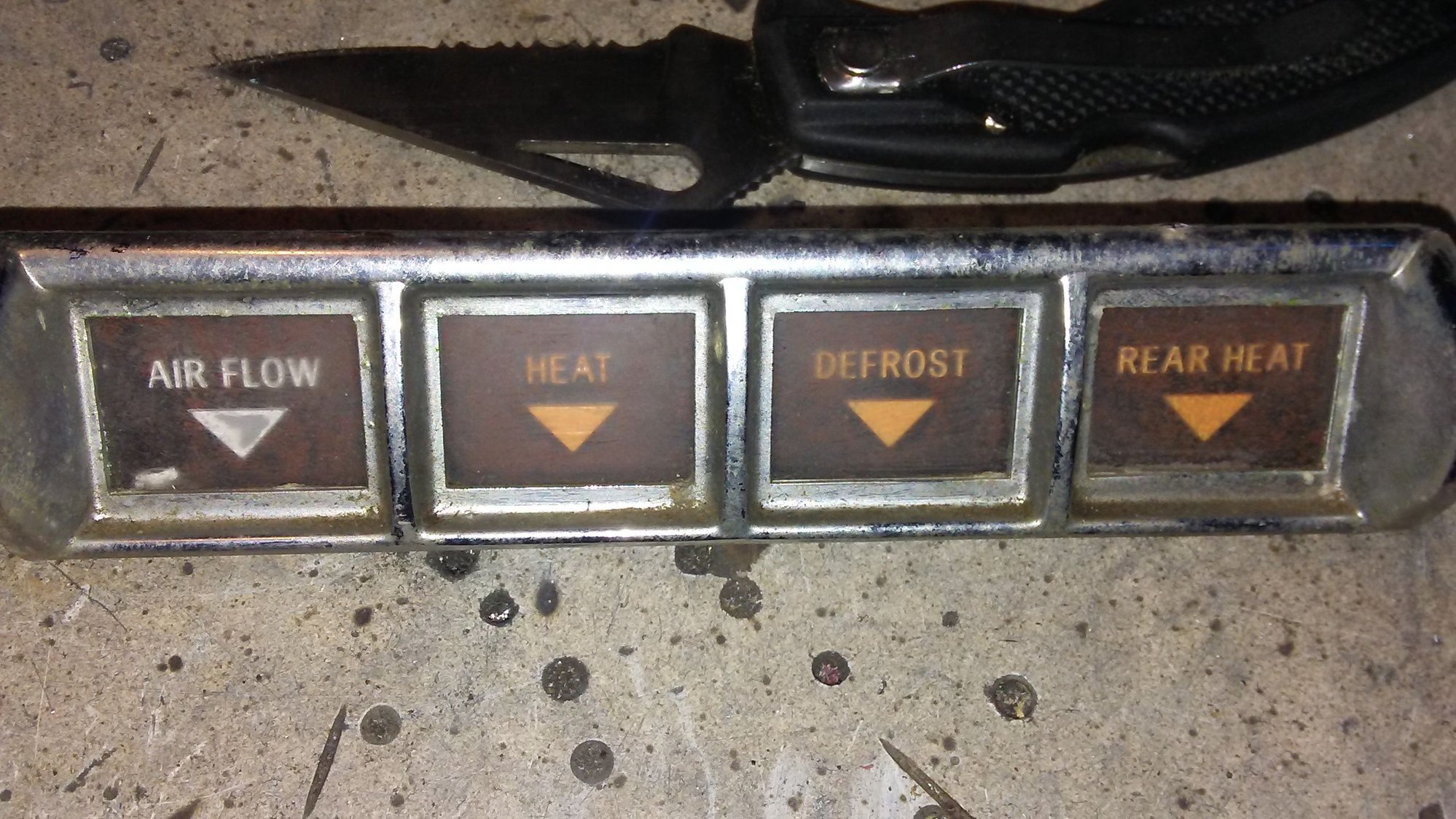 The first dash part I attacked was the adjustment levers for the climate controls. The chrome is dull, the plastic lenses are faded, and the black backing plate is rusty.